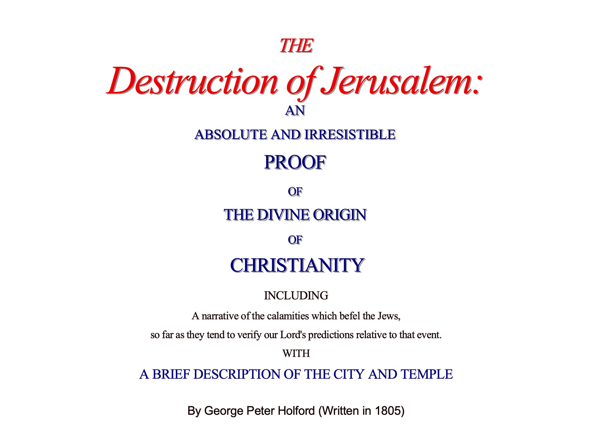 INCLUDING A narrative of the calamities which befell the Jews, so far as they tend to verify our Lord's predictions relative to that event. WITH A BRIEF DESCRIPTION OF THE CITY AND TEMPLE